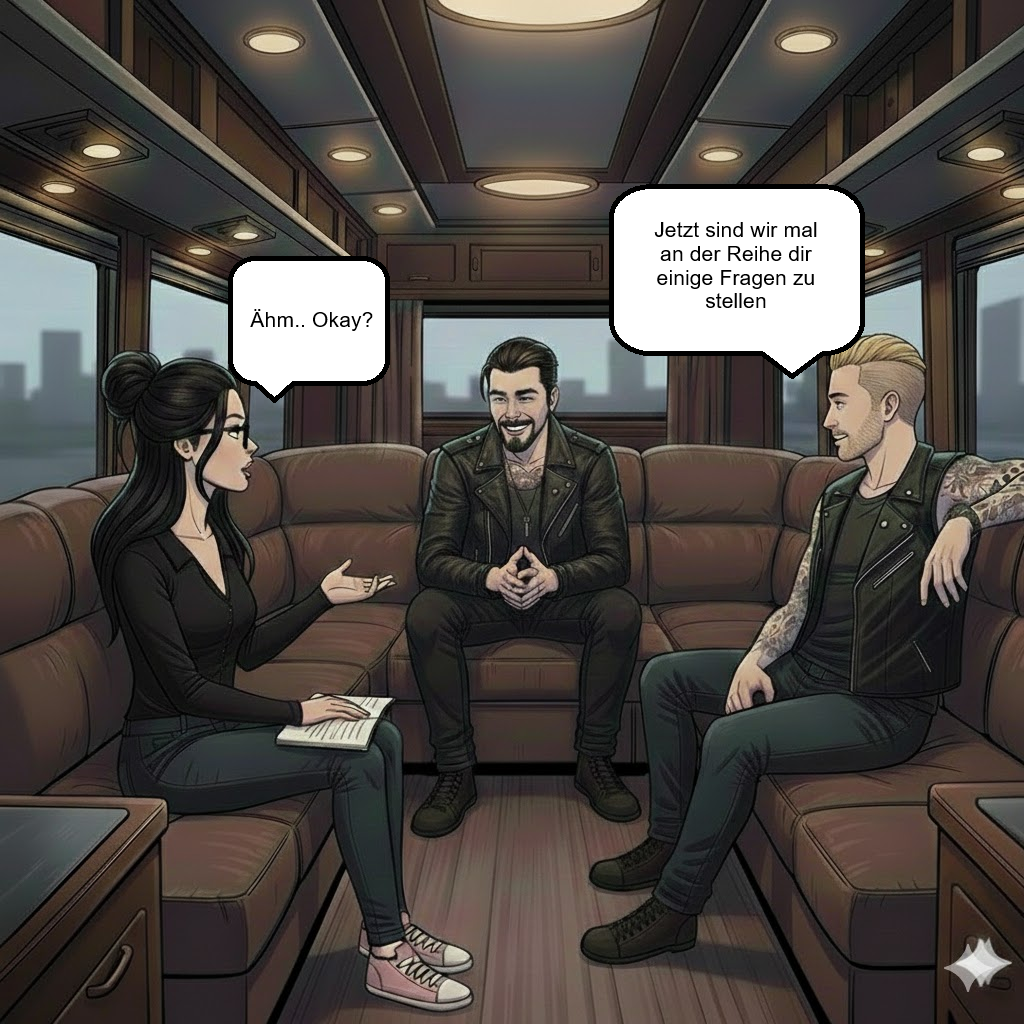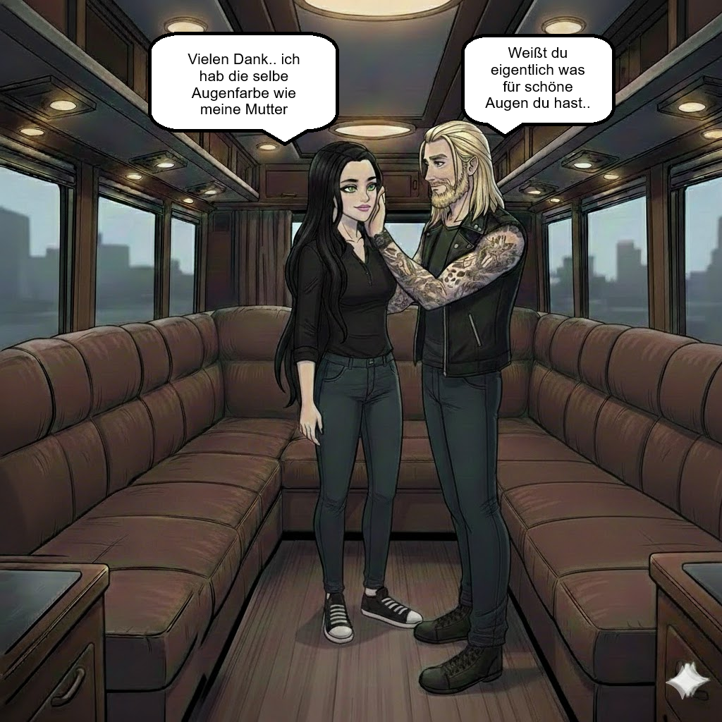Nachdem ich die Fotos auf meinen Laptop geladen habe begann ich mit dem Artikel und nach einer halben Stunde tat mir der Rücken weh ich muss ein wenig Pause machen deshalb stand ich auf und beschloss mich im Bus noch etwas umzusehen ich kenne ja noch nicht alles.. Es gab hier ein Bad und noch zwei weitere „Zimmern“ Ich schaute hinein und sah jeweils in jedem Zimmer ein Stockbett Taylor:“ Na möchtest du doch kuscheln?“ Ich zuckte zusammen und drehte mich schnell um Ich:“ Hey Taylor.. Nein ich hab mich nur ein wenig umgesehen“ Taylor:“ Hier schlafen Jack und James und ich bin im anderen Zimmer“ Ich:“ Und Alec?“ Taylor:“ Er Pennt draußen auf der Couch.. wir wären deshalb ungestört Unicorn“ Ich kicherte Ich:“ Du sag mal Taylor gibt es eine Möglichkeit jemanden Backstage zu bringen?“ Taylor:“ Wen meinst du denn?“ Ich:“ Meine beste Freundin sie ist ein Riesen Fan und würde euch gern kennenlernen“ Taylor:“ Das bekommen wir schon hin“ ich lächelte breit Ich:“ Danke Taylor!“ Ich umarmte ihn und als ich merkte was ich da gerade mache löste ich mich sofort Ich:“ Sorry“ Er lachte Taylor:“ Hey wir sind auch nur normale Menschen auch wenn wir berühmt sind“ Ich wurde rot und senkte den Kopf Taylor:“ Wie weit bist du mit dem Artikel gekommen?“ Ich:“ Ach da brauch ich noch lange ich bin froh das ich einen Monat dafür bekommen habe“ Plötzlich legte er seine Hand auf meine Wange und lächelte Taylor:“ Weißt du eigentlich was für schöne Augen du hast?“ Ich schaute ihn verlegen an ich hab die Augen von meiner Mutter wir beide hatten grüne Augen ich vermisse sie sehr Ich:“ Vielen Danke“ Taylor:“ Ich hab noch nie so ein leuchtendes grün gesehen“ Ich:“ Ich hab die Augen von meiner Mutter“ Taylor:“ Sie muss eine wunderschöne Frau sein“ Ich:“ Das war sie wirklich“ Er schaute mich fragend an Ich:“ Ich hab meine Eltern vor drei Jahren verloren sie hatten einen schlimmen Unfall seitdem bin ich allein“ Taylor:“ Das tut mir leid“ ich seufzte Ich:“ Na gut ich sollte mal wieder weiter schreiben“ Taylor:“ Hey ich koche was für uns zur feier des Tages das du ab heute zu uns gehörst“ Ich schmunzelte Ich:“ Taylor ich gehöre nur zu euch für vier Wochen“ Taylor:“ Wer weiß vielleicht gefällt es dir dann so gut bei uns das du länger bleiben möchtest“ Er zwinkert mir zu und ging in die Küche.. Ich mag Taylor er ist total nett auch die anderen Jungs sind echt lieb zu mir nur werde ich aus Alec nicht schlau doch das ändert sich hoffentlich die nächsten Tage.. Ich wollte zum Tisch zurück gehen als ich plötzlich Alec sah er stand beim Bad und schaute mich traurig an Alec:“ Du hast deine Eltern verloren?“ Er hat meine Geschichte also gehört? Ich nickte ihm zu Alec:“ Das tut mir leid“ Ich:“ Danke“ Alec:“ Ich weiß wie das ist jemanden zu verlieren den man liebt“ Ich runzelte die Stirn und wollte nachfragen was er damit meint doch er dreht sich um und wollte gehen doch bevor er ging sagte er noch etwas was mich aus der Fassung bringt Alec:“ Taylor hat recht.. du hast wunderschöne Augen“ Damit ging er zu den anderen Jungs und ich schaute ihm hinterher.. hat mir Alec Sinclair gerade wirklich ein Kompliment gemacht? Ich atme tief durch und ging kurz ins Bad ich muss mich zuerst beruhigen bevor ich zurück kann denn sonst sieht jeder wie sehr mich dieser Mann verwirrt.. Nachdem ich mir das Gesicht kalt abgewaschen habe ging es mir schon etwas besser das ich zurück zum Tisch gehen konnte ich setzte mich hin und setzte mir wieder die Brille auf James:“ Jetzt sind wir mal an der Reihe dir einige Fragen zu stellen“ ich schaute James an und nickte vorsichtig Ich:“ Ähm okay?“ James:“ Wieso Journalistin?“ Ich:“ Ich liebe es zu schreiben und es gibt viel spannendes auf der Welt worüber man berichten kann“ James:“ worüber schreibst du denn sonst noch außer über heiße Kerle?“ Er lehnte sich zurück und grinste mich an Ich:“ Naja ich hab ein Bericht erst fertig gestellt und über die Politik geschrieben zum Beispiel“ Jack:“ Schreibst du gut?“ Ich schaute Jack an und nickte Ich:“ Ich denke schon sonst wäre ich nicht hier“ Die Jungs grinsten Jack:“ Dann bin ich schon gespannt was du über uns schreibst“ …