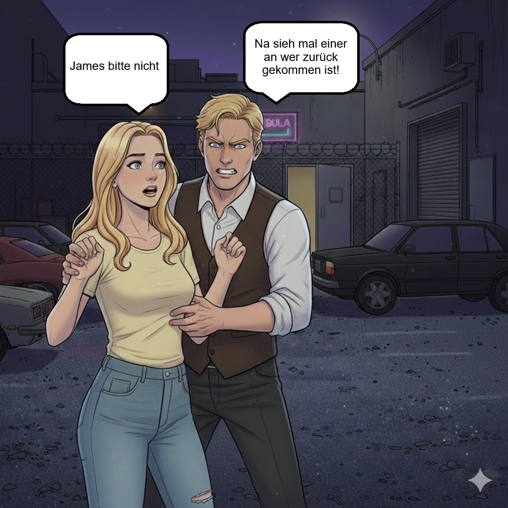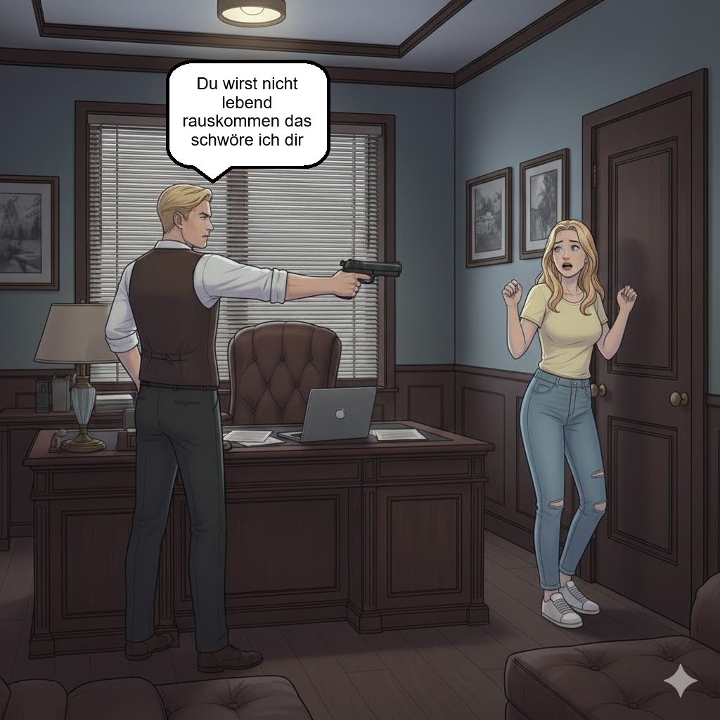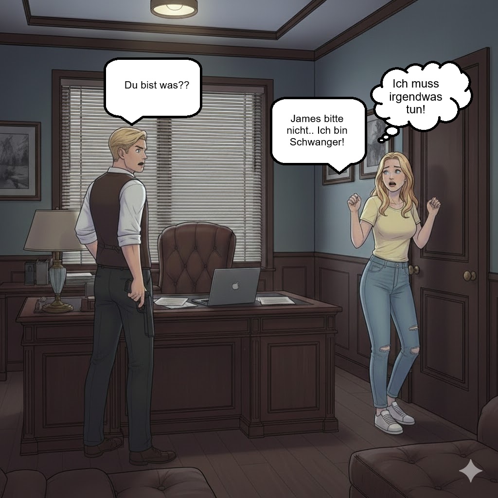 Ich ging lange spazieren und weiß überhaupt nicht wohin ich gehe ich gehe einfach los. Plötzlich stand ich vor dem Club.. was mach ich denn hier? Da wollte ich ganz bestimmt nicht hin.. Aber jetzt wo ich schon mal hier bin vielleicht kann ich mit James reden und ihm einfach Fragen ob er ein Mörder ist.. mehr als das er mich auch erschießt kann nicht passieren. Ich schüttelte den Kopf und wollte weiter gehen doch plötzlich kam James aus dem Club und wollte gerade zu seinem Wagen gehen doch als er mich sah blieb er sofort stehen und schaute mich wütend an James:“ Na sieh mal einer an.. wer ist denn hierher zurück gekrochen?“ Ich:“ Ich wollte bloß spazieren gehen das ist alles“ Er kam mit schnellen schritten auf mich zu und packte mich am Arm James:“ Du gehst nirgendwo mehr hin du kommst jetzt sofort mit“ Er zerrte mich zurück in den Club und in sein Büro und verschloss die Tür Ich:“ Ich hab den Stick nicht bei mir“ James:“ Dann holst du ihn einfach oder du wirst bald nicht mehr laufen können Baby“ Ich:“ Wieso ist dir dieser Stick so wichtig? Wer ist dieser Junge?“ Er wurde so wütend das er sämtliche Sachen von seinem Schreibtisch zu Boden warf James:“ DAS GEHT DICH EINEN SCHEIß AN VERSTANDEN!!!“ Ich bekam richtige Angst James:“ Ich will diesen Stick sofort zurück und dann wirst du mich richtig kennenlernen.. Ich lass mir das alles nicht gefallen von dir versteh das endlich! Du bist bloß eine Nutte nicht mehr“ Ich:“ Ich dachte du magst mich.. Du warst Gestern echt lieb zu mir“ Er lachte auf James:“ Ich dich mögen? Ganz bestimmt nicht du bist bloß gut zum Vögeln mehr nicht“ Ich wurde Traurig aber das bin ich bei James nicht anders gewöhnt Ich:“ Ich kann dir den Stick nicht besorgen die Polizei hat ihn“ James:“ DU STECKST MIT DEN BULLEN UNTER EINER DECKE?“ Er verpasste mir eine Ohrfeige und ich fiel zu Boden James:“ Du wirst nicht lebend rauskommen das schwöre ich dir“ Er holte seine Waffe vom Schreibtisch und zielte sie auf mich ich bekam solche Angst wie noch niemals zuvor Ich:“ James.. Bitte nicht.. Ich flehe dich an das darfst du mir nicht antun!!“ Ich muss mir irgendwas überlegen damit er mich am Leben lässt.. ich dachte nach und da sagte ich irgendwas das ihm beruhige Ich:“ Ich bin Schwanger!!! Ich bekomme ein Kind von dir!!!“ Er schaute mich erschrocken an und senkte seine Waffe James:“ Was?“ Ich:“ Ich bin Schwanger du darfst mir nichts antun ich bekomme unser Kind.. Ich hab es erst heute Morgen erfahren ich hab einen Test gemacht“ Hoffentlich glaubt er mir diese lüge James:“ Du bekommst ein Kind? Von mir?“ Ich nickte und er drehte sich um und ging zu seinem Schreibtisch dann ließ er sich fallen und schaute ins leere. Ich stand langsam auf James:“ Ich werde Vater“ Ich:“ Bitte lass mich gehen James“ James:“ Nein.. jetzt bleibst du erst recht bei mir ich muss auf euch aufpassen“ Ich:“ Das hier ist kein Leben für ein Kind ich kann es doch nicht in diesem Club großziehen.. Bitte James lass mich gehen“ Er schaute mich an und stand langsam wieder auf James:“ Ich bring dich von hier weg.. Du wohnst ab sofort bei mir“ Oh man das war nicht mein Plan jetzt werde ich ihn überhaupt nicht mehr los was hab ich mir nur dabei gedacht diese lüge zu erzählen? Ich:“ Bei dir? James die Polizei ist hinter dir her wieso gehst du nicht einfach zu ihnen und stellst dich? Für unser Kind zu liebe“ James:“ Damit ich für immer hinter Gitter komme? Ganz bestimmt nicht mein Kind braucht einen Vater also los lass uns gehen“ Er nahm meine Hand und zerrte mich aus dem Club dann gingen wir zu seinem Wagen und er zwang mich einzusteigen.. Verdammte scheiße wie komm ich nun aus dieser Sache wieder raus? Philipp weiß nicht wo ich bin ich hab nicht mal mein Handy mit und wenn James erfährt das ich nur gelogen habe bringt er mich sofort um.. Ich bin so was von am Arsch!…